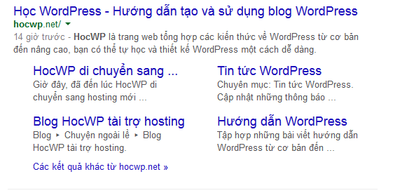 Như vậy là sau gần 6 tháng blog HocWP đi vào hoạt động, hiện tại thì trên kết quả tìm kiếm của Google đã xuất hiện sitelinks của blog Học WordPress. Đây là một tin đáng mừng, thật ra thì sau khi hoạt động 2 tháng thì Sáu đã thấy sitelinks xuất hiện nhưng chỉ nằm ở con số 2, bây giờ thì số sitelink đã nâng lên thành 4.
