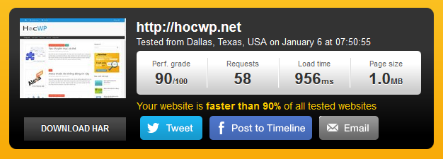 Nếu bạn đã thực hiện ít nhất 3 trong 6 bước hướng dẫn tăng tốc độ cho website bên trên thì trang của bạn có thể sẽ có tốc độ tải trang nhanh hơn. Hãy cho mọi người xem kết quả khi test thử trang blog của bạn. Bên dưới là những gì mà Blog Học WordPress đã làm được.