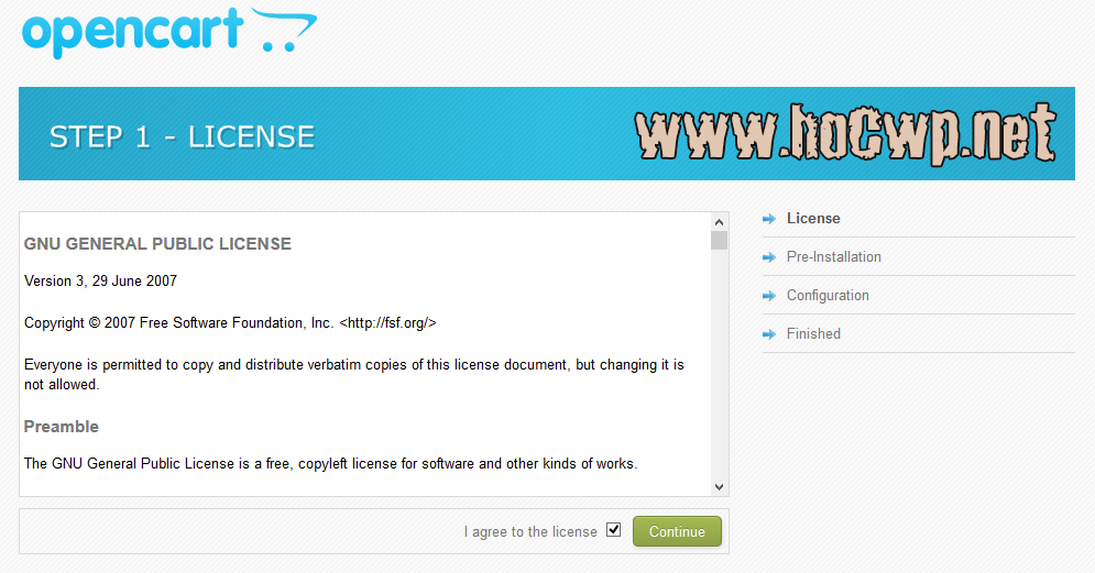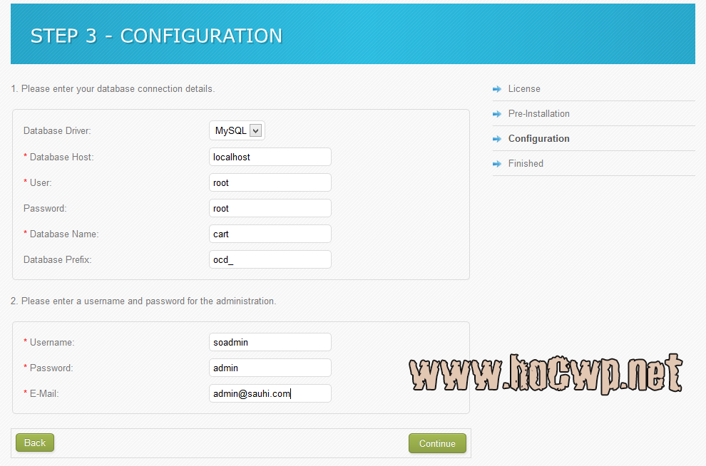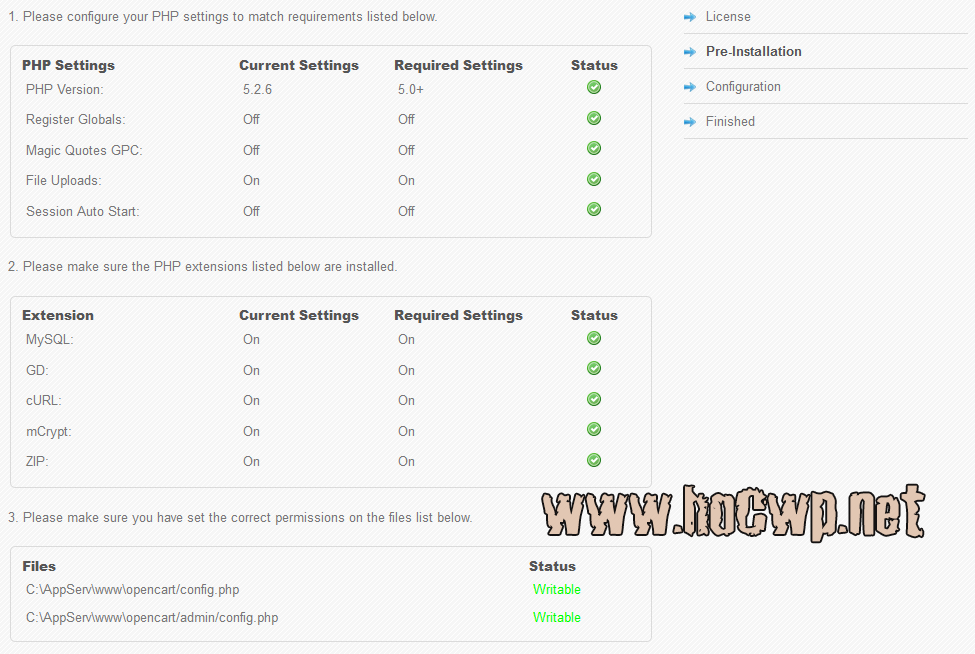 Trong bước 2, OpenCart sẽ kiểm tra lại xem bạn đã thiết lập server đáp ứng đủ yêu cầu tối thiệu của nó hay chưa. Nếu bạn thấy một mục nào đó còn xuất hiện biểu tượng màu đỏ thì nên đọc lại phần phía trên để thiết lập lại. Nếu như tất cả đều là màu xanh thì coi như bạn có thể nhấn continue để chuyển sang bước 3.