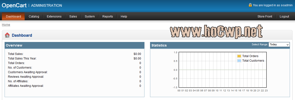 Gõ vào tên tài khoản và mật khẩu mà bạn đã thiết lập trong bước cài đặt bên trên. Sau khi đăng nhập thành công thì bạn sẽ thấy được giao diện quản lý admin của OpenCart, tuy nhiên đây là phiên bản chưa phải là mới nhất nên giao diện bảng điều khiển cũng không phải là đẹp nhất.