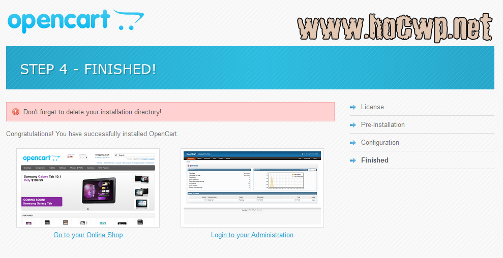 Bây giờ bạn có thể đăng nhập vào bảng điều khiển admin hoặc xem shop demo mà OpenCart đã tạo sẵn, kết quả rất tuyệt vời phải không nào. Bạn không cần phải biết nhiều về code, bạn chỉ cần xem hướng dẫ để cài đặt và sử dụng, bạn hoàn toàn có thể mở được shop hoặc cửa hàng online theo ý muốn.